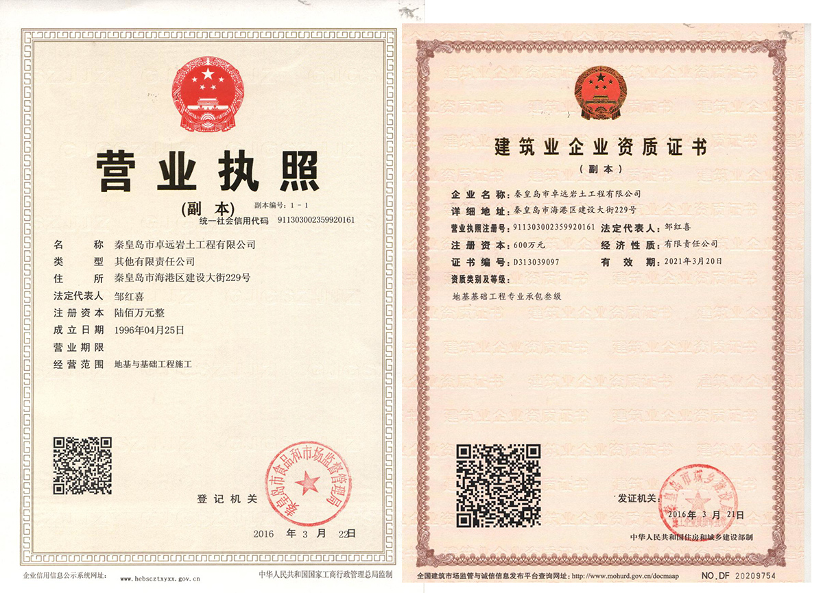 秦皇島市卓遠(yuǎn)巖土工程有限公司成立于1996年4月,是較旱在秦市從事巖土工程施工的單位之一,擁有碩士生3人、高級(jí)工程師4人、國家注冊巖土工程師3人、項(xiàng)目經(jīng)理5人、巖土工程師15人、市建委專家2人、預(yù)算師2人、機(jī)械師2人。擁有強(qiáng)夯機(jī)1臺(tái)、水準(zhǔn)儀2臺(tái)、全站儀2臺(tái)、夯擴(kuò)機(jī)2臺(tái)、長螺旋樁機(jī)2臺(tái)。